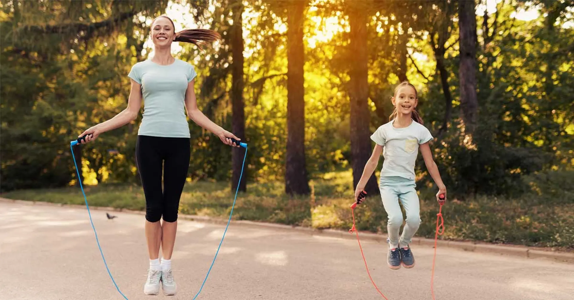 Hai người đang nhảy dây trên con đường trong công viên, ánh nắng chiếu qua hàng cây phía sau.